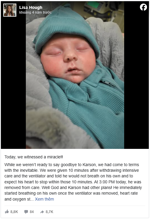 “Today, we witnessed a miracle!!” Lisa Hough wrote. “We were given 10 minutes after withdrawing intensive care and the ventilator and told he would not breath on his own and to expect his heart to stop within those 10 minutes… Well God and Karson had other plans!