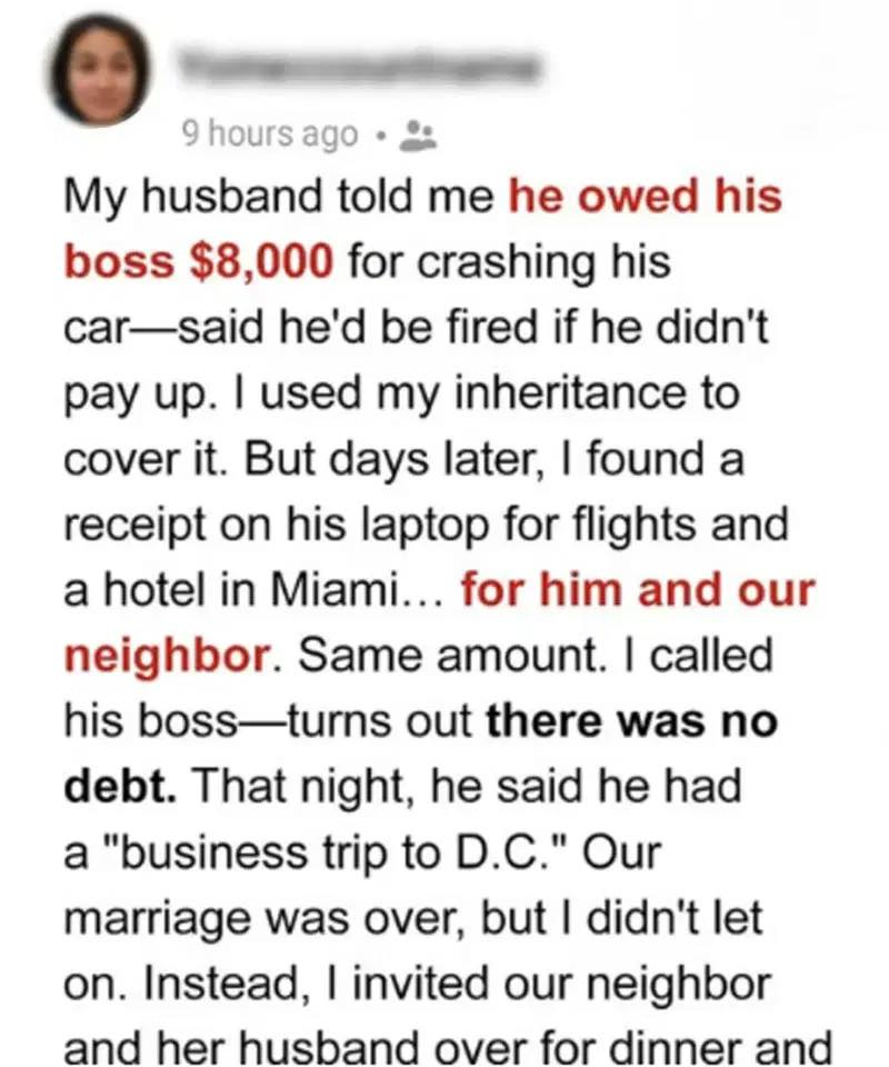 Days later, while casually using Mike’s laptop to search for a recipe, she uncovered shocking evidence: flight and hotel bookings for two to Miami. The names on the reservation were Mike and Sarah—who happened to be their married neighbor. Even more suspicious, the cost of the trip was nearly identical to the “debt” Mike claimed to owe.