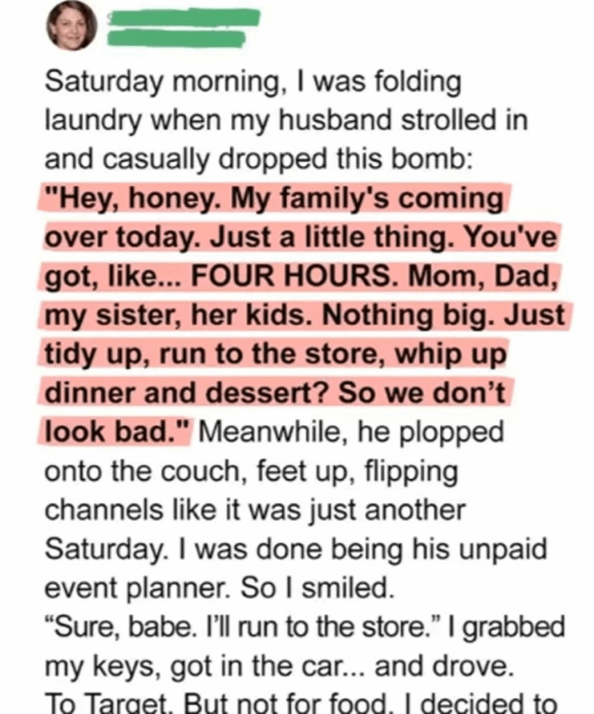 Instead of arguing, she agreed to go shopping but used the opportunity to escape. At Target, she relaxed with a latte, browsed at her own pace, and took a much-needed break from her husband’s unreasonable expectations. She later texted him that traffic was bad, giving herself even more time to unwind.