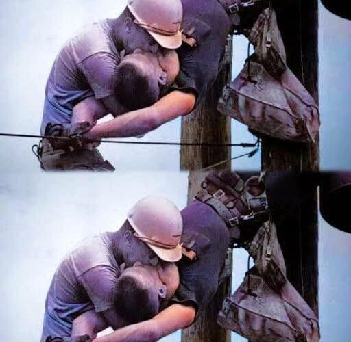 The photo shows an unconscious electrical worker suspended from a utility pole, held only by his safety harness, while a coworker balances beside him and performs mouth-to-mouth resuscitation—high above the ground and surrounded by live power lines. It is a moment where danger, urgency, and humanity collide.